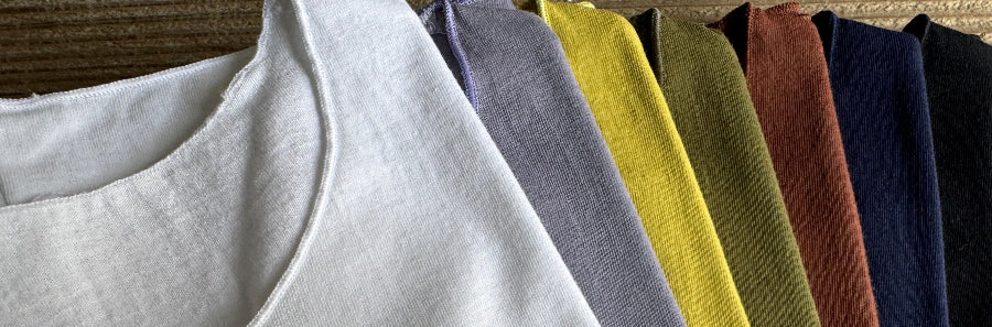 デザイナー坂田敏子 糸や布などの素材と色や形の無限のアプローチとコンビネーションで、 さりげなく着ている人が引き立つような、シンプルなのに一味違うデザインです。