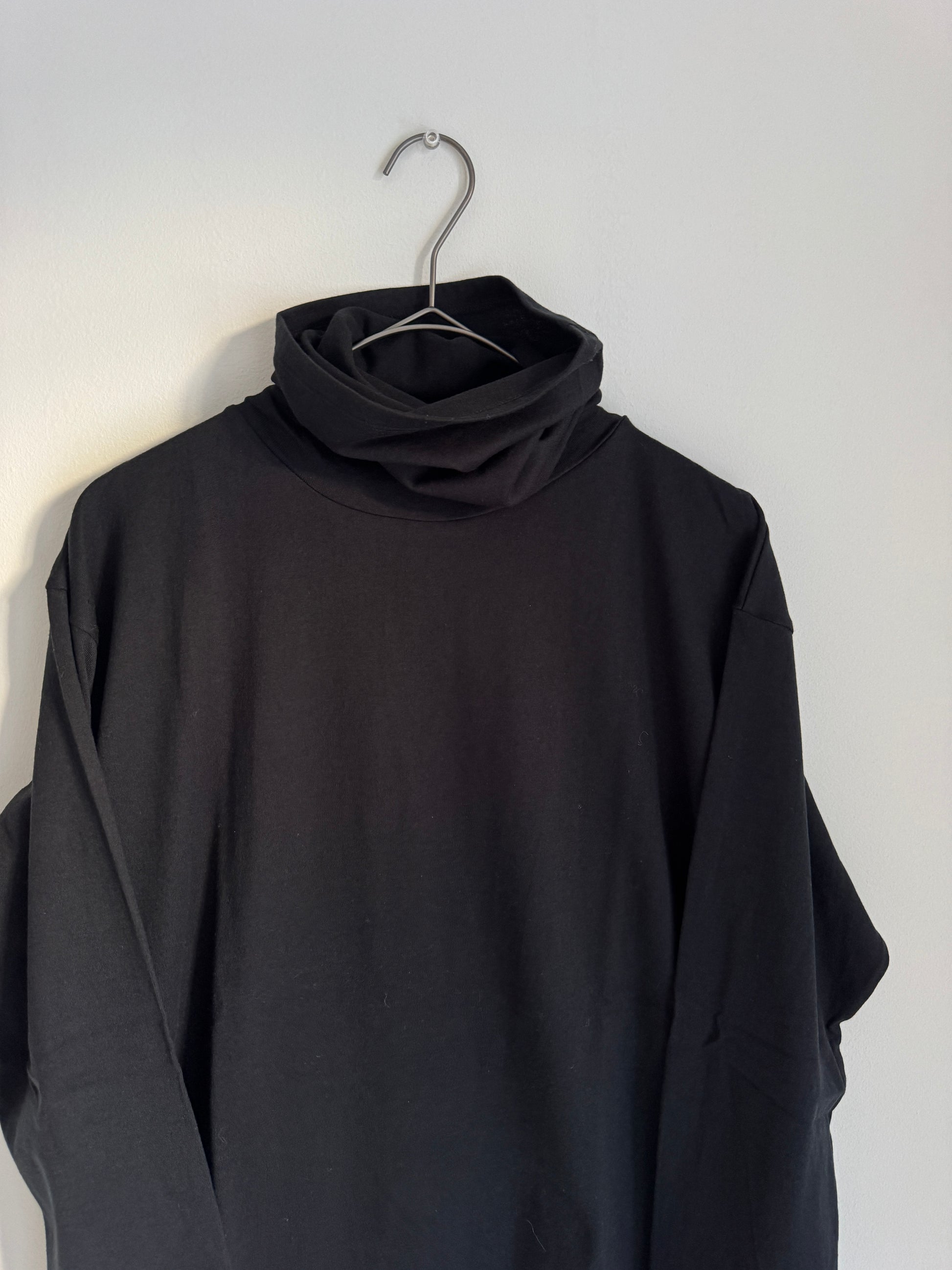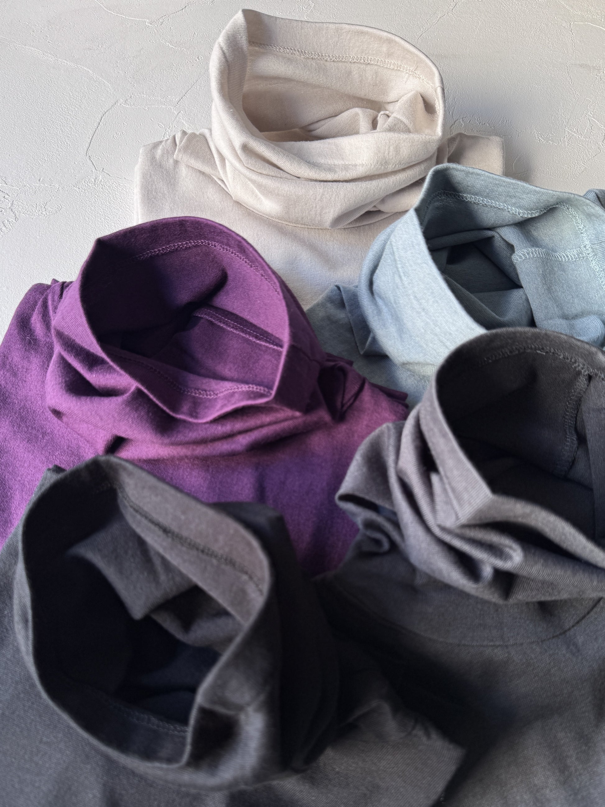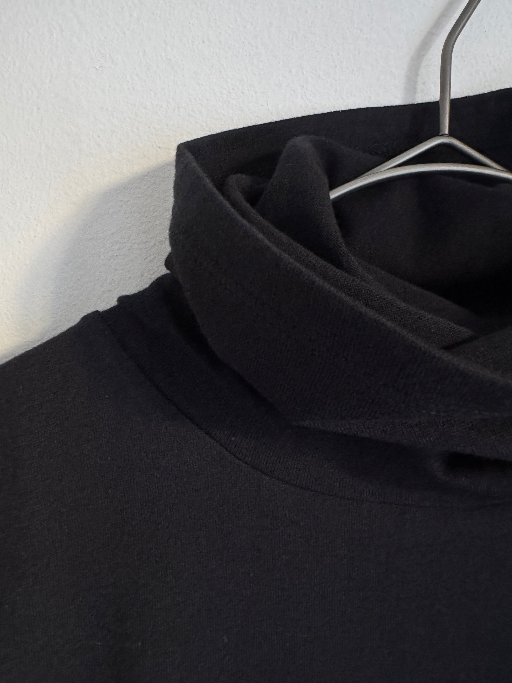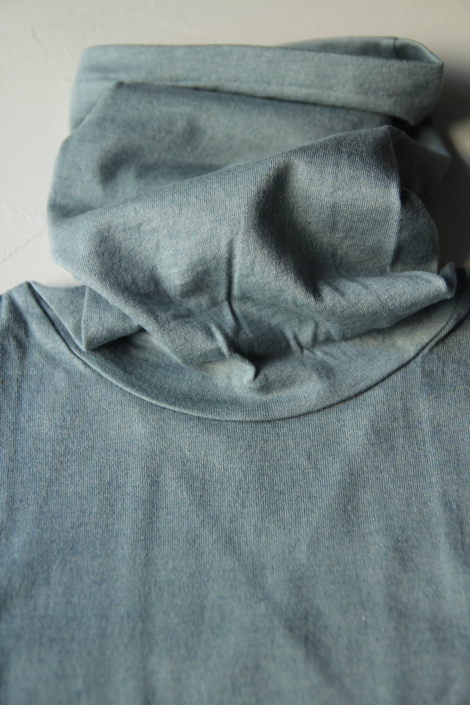 綿糸にウールを加えて編んだ暖かみのある素材のタートルです。防縮加工したウール糸を使用しているので縮みをあまり気にせず使用いただけます。衿のタートルを一枚仕立てにして長くしています。首に気持ち良くなじんでくれます。身頃は程良いサイズの長袖です。着丈は少し長め。