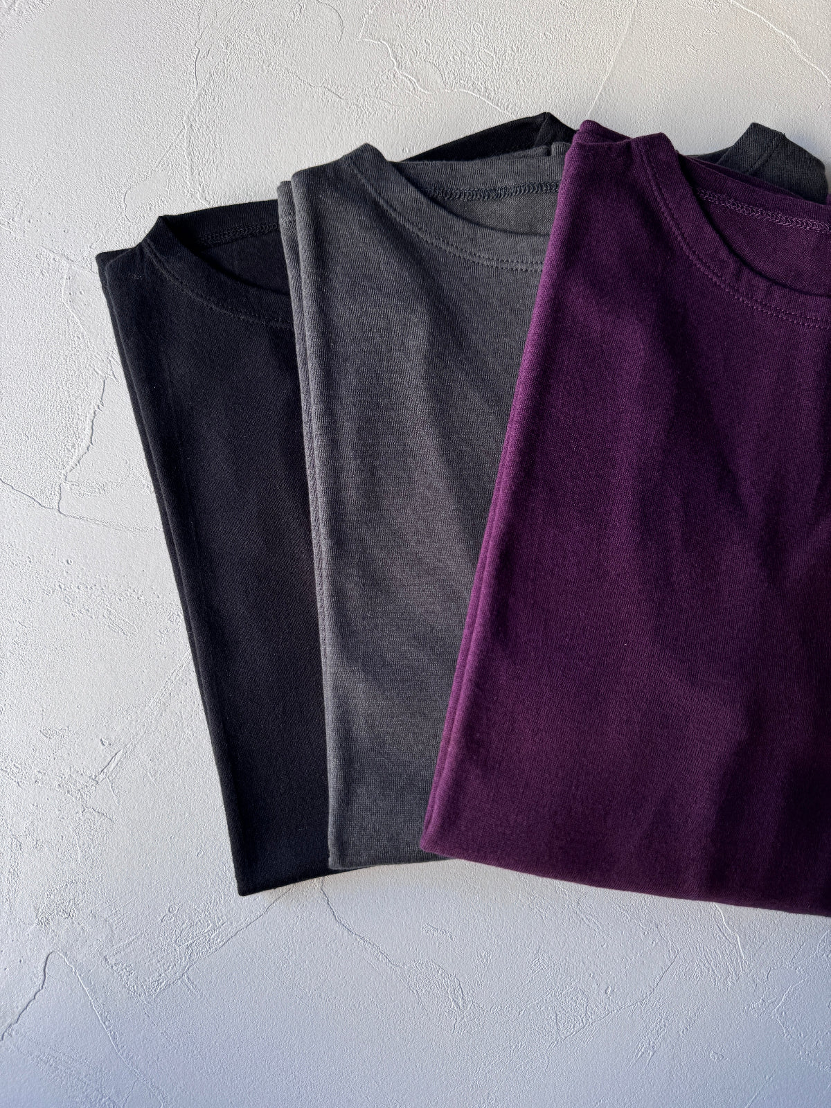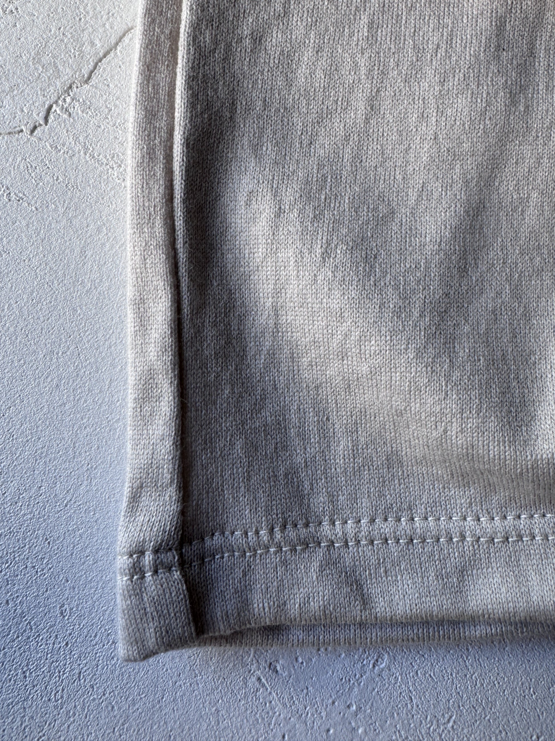 綿糸にウールを加えて編んだ暖かみのある素材のハイクルーネックです。防縮加工したウール糸を使用しているので縮みをあまり気にせず使用いただけます。ネックラインが首周りに沿って若干の高さがあります。通常の丸首よりも開きが小さく首元がやや詰まって見えます。襟ぐりを二本針ステッチにしているので型崩れしにくいです。