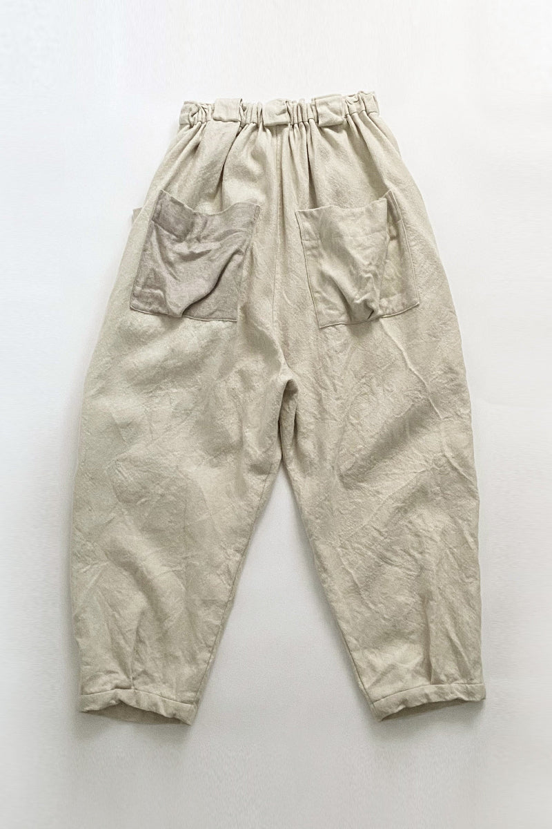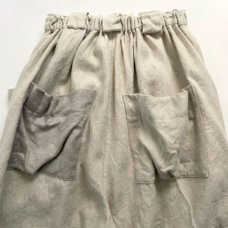 左ひざに別布の大きなポケット。後ろポケットも左右違う別布を使って遊んでいます。