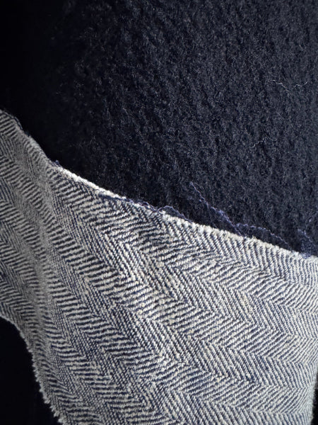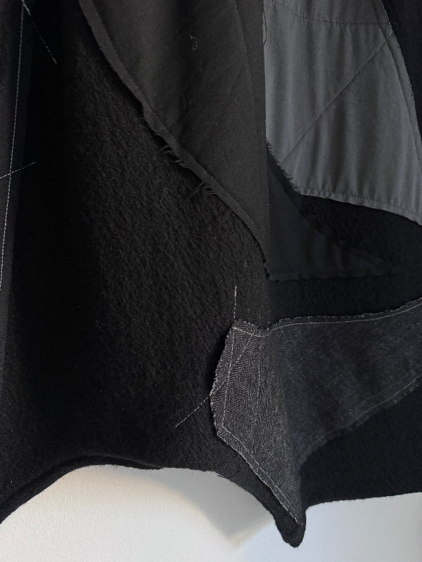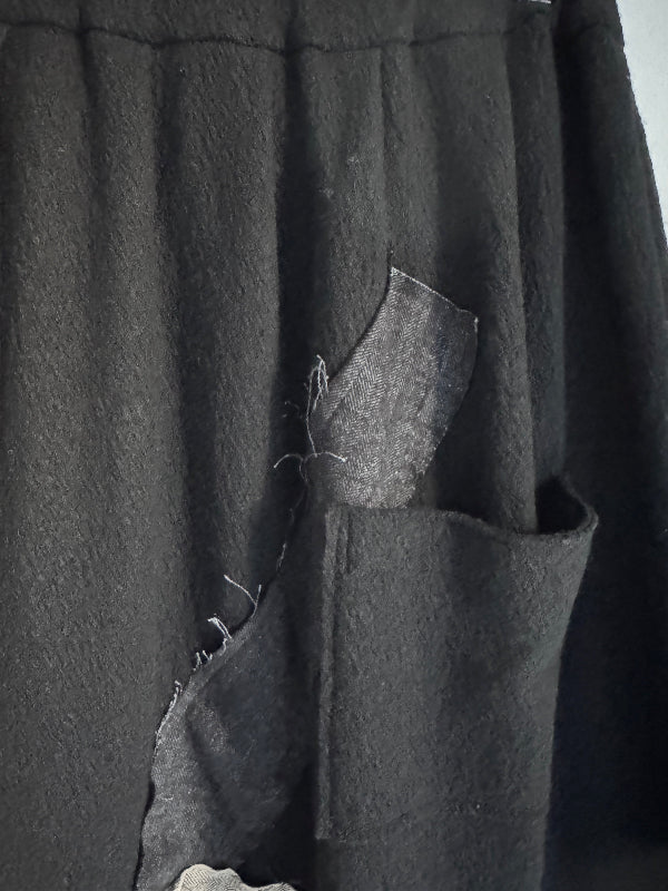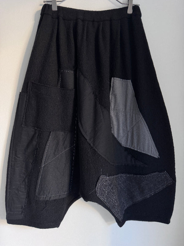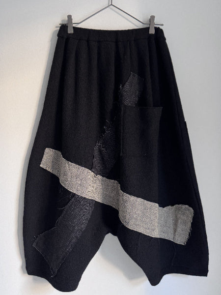 布帛の端切れをグラフィックに縫い付けて、楽し気な気分になるパンツです。