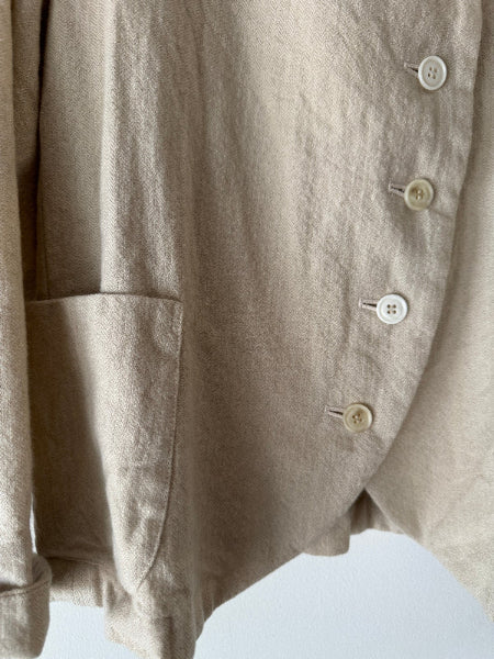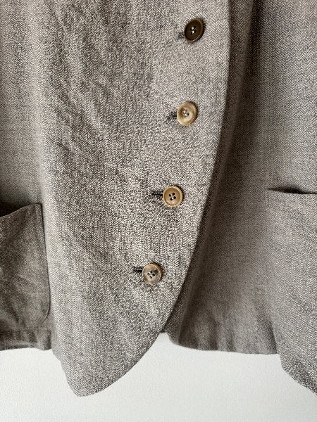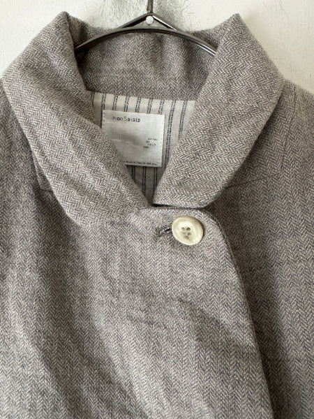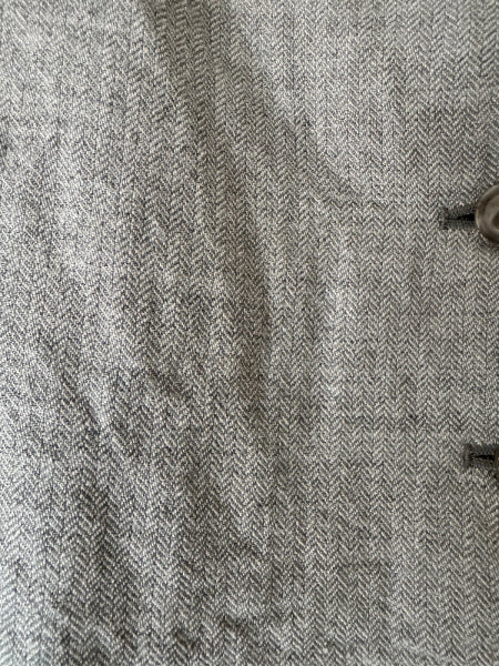 生地は毛と麻の糸を使い細かい柄のヘリンボーン織りです。毛の柔らかさと麻の張り感があり、程よい厚みの素材です。
